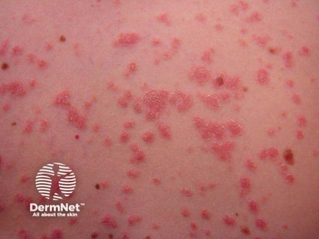 Guttate psoriasis often starts in childhood or young adulthood following streptococcal or upper respiratory infection. It presents with multiple red, slightly scaly plaques, predominantly on trunk and proximal limbs. This form of psoriasis often resolves within a few months, but may reappear at a later date or progress to plaque psoriasis.