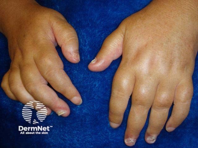 In acrodermatitis continua, painful pustules arise at the base of fingernails and toenails, resulting in destructive nail dystrophy. It is strongly associated with an unpleasant form of psoriatic arthritis, arthritis mutilans.