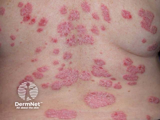 Chronic plaque psoriasis is the most common form of the disease, and is typically found on the elbows, knees, scalp and lower back. There may be few or many thickened, erythematous plaques covered by a silvery white scale.