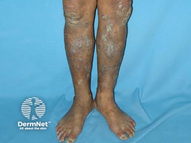 Ostraceous psoriasis resembles an oyster shell with very thickly scaled, ring-like areas of psoriasis.