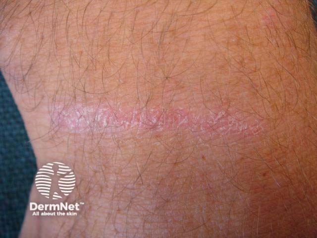 Linear psoriasis is psoriasis arranged as a line. Most often this pattern represents koebnerisation, i.e., psoriasis appearing in skin that has been recently injured by scratching, cutting or surgery.