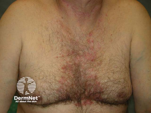 Sebopsoriasis is the term used when the skin condition has characteristics of both seborrhoeic dermatitis and psoriasis and is confined to seborrhoeic areas, i.e., scalp, mid-face, axillae and anterior chest. It tends to have poorly-defined and thin plaques, covered with yellowish scale, like seborrhoeic dermatitis. But it is persistent and resistant to treatment, like psoriasis.