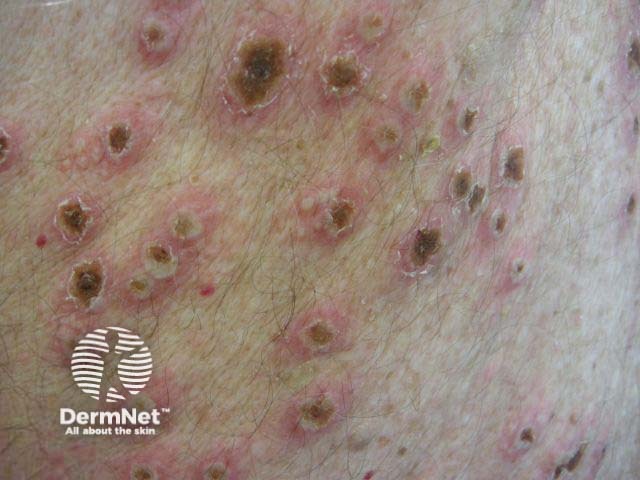 Grouped or herpetiform lesions due to Herpes simplex may be vesicular, pustular, eroded or crusted. Pustules may be very extensive in immunosuppressed patients (the patient illustrated had chronic lymphocytic leukaemia).