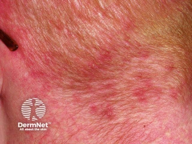 Rosacea may affect the scalp, resulting in asymptomatic erythematous follicular papules and pustules. It usually responds well to tetracycline antibiotics.