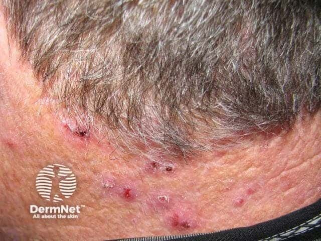 Acne necrotica refers to deep, painful pustules covered with eschar, which resolve with scarring. Scalp folliculitis may be controlled but rarely cured by long-term oral tetracyclines, e.g. doxycycline 50-100mg daily, or low-dose isotretinoin, e.g. 5 to 10mg daily.