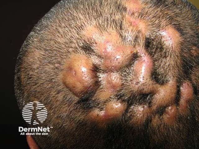 Dissecting cellulitis results in unsightly and painful interconnecting inflammatory nodules and draining abscesses. Its other name is perifolliculitis capitis abscedens et suffodiens. It often results in extensive areas of permanent hair loss. It is often associated with other disorders in which there is follicular occlusion, including acne conglobata and hidradenitis suppurativa. Dissecting cellulitis is extremely resistant to treatment. Oral retinoids, high dose antibiotics and/or surgical drainage may help.