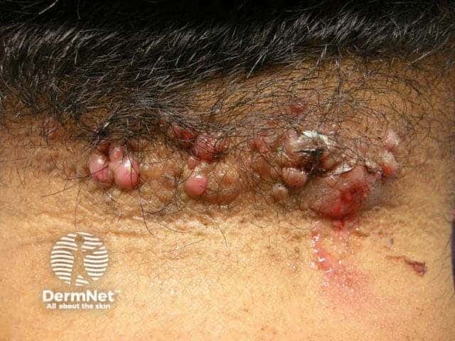 Folliculitis keloidalis (formerly known as acne keloidalis) affects the occipital scalp. The primary lesion is a follicular pustule. Marked inflammation eventually results in large thickened hairless scars. It is more prevalent in black-haired, dark-skinned individuals. Treatment is challenging but may include oral retinoids, high dose antibiotics and surgery.