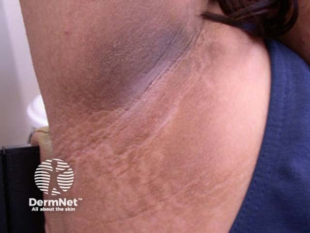 Thickened 'velvety' brown plaques are due to acanthosis nigricans. The same darkened skin is commonly seen in the neck folds. It is caused by insulin resistance and is often a complication of obesity. Weight loss can result in improvement. Acanthosis nigricans may also arise in various endocrine syndromes and rarely, as a paraneoplastic phenomenon. The skin thickening may be lessened with the help of keratolytic creams.