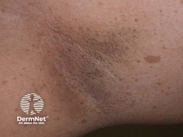 Axillary freckling, or a brown mark with peripheral freckling, is characteristic of neurofibromatosis type 1. Multiple café au lait macules are common from early childhood. Cutaneous, subcutaneous, nodular and diffuse plexiform neurofibromas may arise during adult life. These may be excised individually if desired. Look out for signs that tumours are affecting the central nervous system.