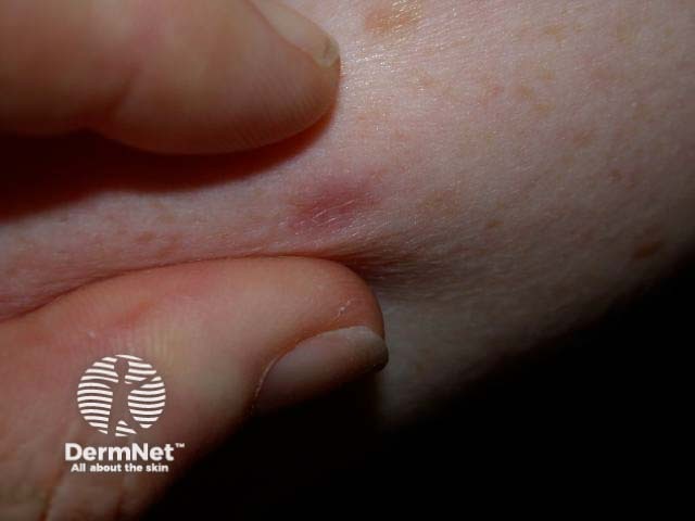 A dermatofibroma, also called benign fibrous histiocytoma, is a firm dermal papule most often located on the lower limbs. Other common sites include thighs, upper arms and shoulders. These lesions are firmly adherent to the skin so that there is a central dimple if compressed between two fingers. Dermatofibromas may be skin coloured, pink or brown, and tend to be paler in the centre. This central pallor is more marked on dermatoscopy. Dermatofibroma often follows an insect bite and is persistent. No treatment is required.