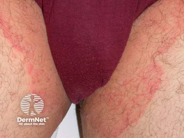 This is tinea cruris – acceptable synonyms include tinea inguinalis, groin dermatophytosis, ringworm of the groin, gym itch, eczema marginatum, dhobie itch, jock itch and crotch rot!