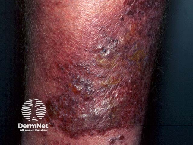 There is a sharply demarcated erythematous eruption on the leg. The skin is swollen and has a patchy peau d'orange appearance with vesicles and bullae containing serous and haemorrhagic fluid.