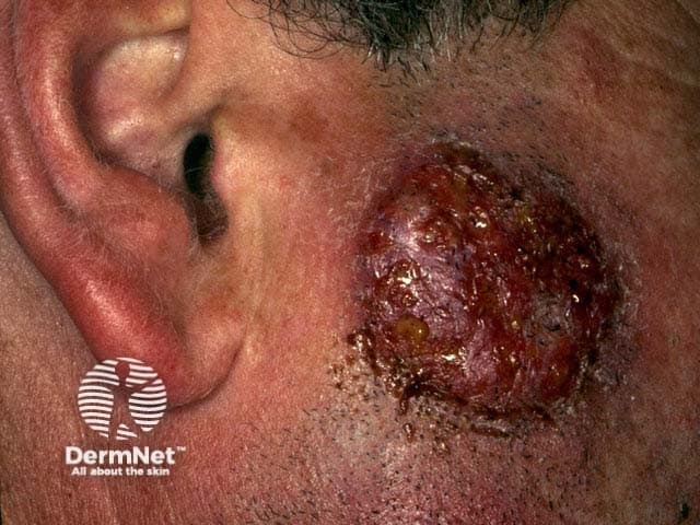 Scrapings should be taken from the leading edge of the lesion. Several loose hairs were pulled out, and placed in a Petri dish. The purulent material was swabbed and smeared onto a glass slide. The specimens were sent to the laboratory for potassium hydroxide microscopy and fungal culture. As initial microscopy was negative, the farmer underwent an incisional biopsy for histology. This was reported to be non-specific, showing a vigorous deep mixed inflammatory infiltrate with destruction of hair follicles.