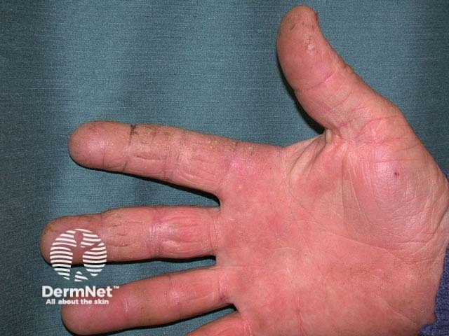 Tinea manuum. This was a surprise to the clinician, as contact dermatitis was thought more likely!