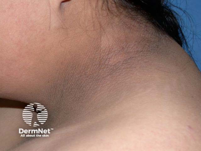 Velvety thickening, pigmentation and increased skin markings on the neck fold are due to acanthosis nigricans. Acanthosis nigricans is a sign of insulin resistance, which may be subclinical or causing type 2 diabetes. Treatment requires addressing obesity, metabolic syndrome and its complications i.e., promoting weight loss, physical activity, ACE inhibitors and metformin.