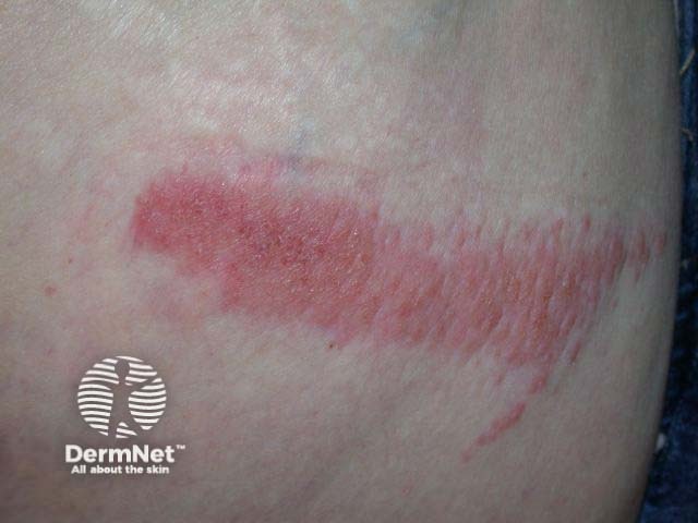 Contact dermatitis may be an odd shape, corresponding with the site of chemical or frictional injury. This case is rhus or toxicodendron dermatitis.