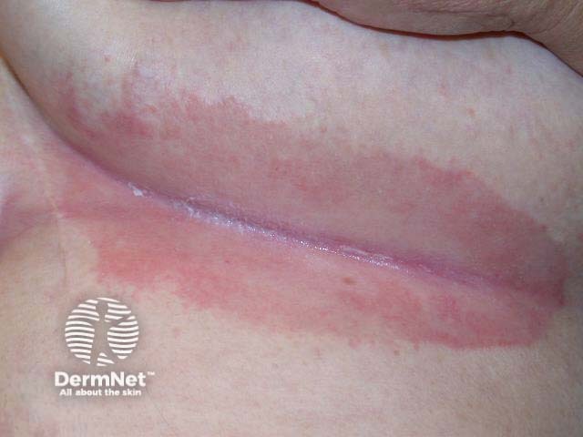 In skin folds such as behind an ear, under an arm, the umbilicus or groin, psoriasis is shiny and smooth.