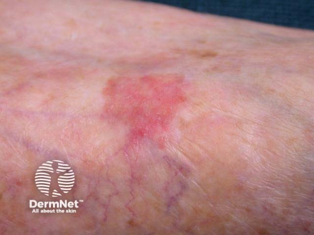 Squamous cell carcinoma in is also slowly growing and irregular in shape, but with more crust or scale. It most often occurs on face or distal limbs. It tends to be orange-red. There is no shiny rim of stretching. Use the dermatoscope to identify irregular clusters of globular or glomerular vessels.
