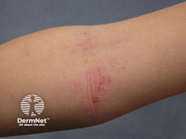 Atopic eczema is very itchy, hence usually scratched. The first patch is most likely to be on a cheek in an infant, and is often in the antecubital fossa in an older child or adult. The margin of the patch merges with surrounding skin.