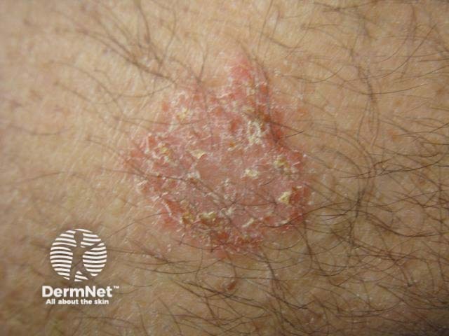 Discoid eczema may be dry, fissured and not particularly itchy, or exudative and intensely itchy. The first lesion may start anywhere, but the lower leg is the most common site. The edge is well demarcated. The first lesion often starts where there is a break in the skin, e.g., insect bite, thermal burn, scratch.