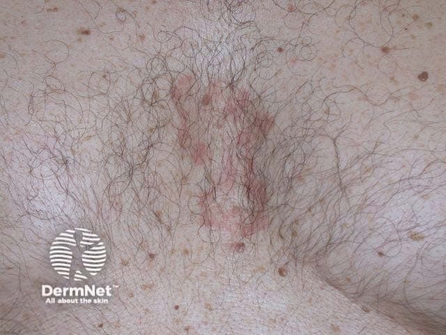 Seborrhoeic eczema is characteristically salmon pink in colour, favouring hairline, behind ears, nasolabial fold, axilla or anterior chest. The lesion is irregular in shape, annular or spotty. It is often covered in bran-like scale that may be brushed off.