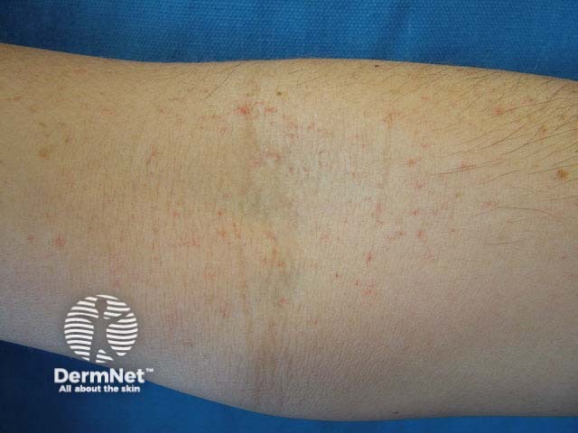 Unilateral nevoid telangiectasia mainly affects women, usually on the face, neck, chest, and/or arms. The very small telangiectases often have a prominent halo of vasoconstriction and may arise in response to a hormonal stimulus, particularly pregnancy.