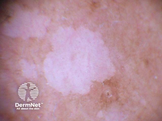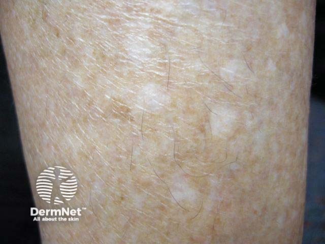 Guttate hypomelanosis on forearms and lower legs is common as part of the ageing process and may appear smooth or slightly dry (first image). They are sometimes confused with pale solar lentigos or flat seborrhoeic keratoses. Dermoscopy is featureless (second image).