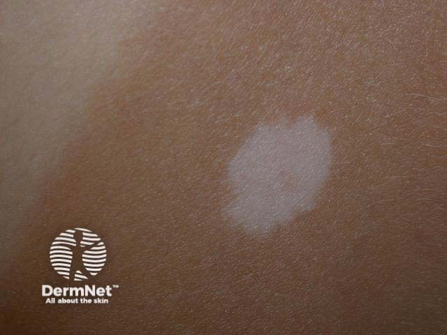 In an adolescent or young adult, a completely white, round or oval, 10 to 15-mm smooth macule or patch may be due to halo mole (Sutton naevus). These are often multiple, so fading naevi may be observed at different stages. Vitiligo quite often begins in childhood and may be associated with halo naevi.