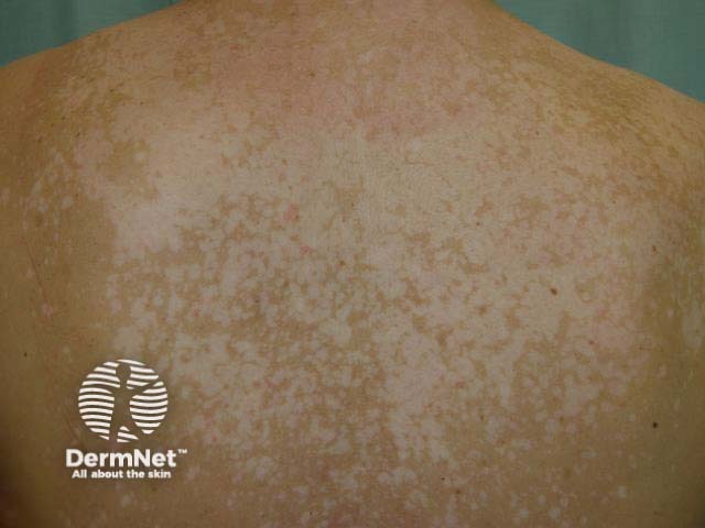 Flaky pale 5 to 10-mm patches on the upper trunk and proximal upper limbs are typical of pityriasis versicolor. Antifungal treatment clears the scaling and yeast, but hypopigmentation may persist long term. On the face, neck, and upper trunk, flaky pale "petaloid" patches may be due to seborrhoeic dermatitis. In both these disorders, hypopigmentation is due to chemicals such as azelaic acid, pityriacitrin and malassezin produced by malassezia.