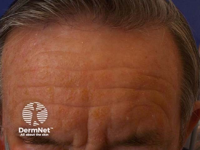 Severe solar damage may rarely result in colloid milia, where there are crops of 1 to 2-mm superficial translucent amber papules coalescing into plaques. They are filled with a gooey yellowish substance.