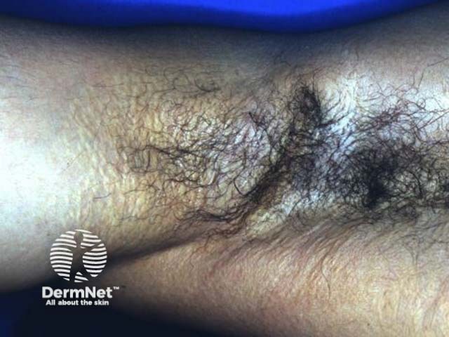 Pseudoxanthoma elasticum (PXE) is a rare genetic disorder due to abnormal elastic tissue. PXE presents in children and young adults as yellowish papules coalescing into plaques. Typically these changes first occur on the sides of the neck, axillae and antecubital fossae and are described as like a plucked chicken. Severe types of PXE weaken elastic tissue around blood vessels and may result in life-threatening complications such as dissection of the aorta.