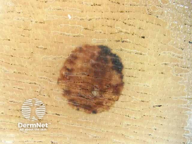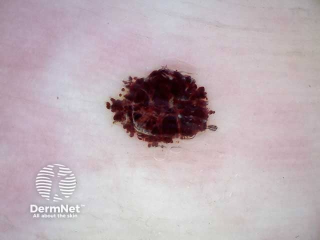 Dermoscopy of subcorneal haematomas demonstrates a red-brown colour; brown, red, and black are less commonly seen. The most common pattern of pigmentation is homogenous, followed by globular and parallel ridge. See also Dermoscopy of other non-melanocytic lesions.