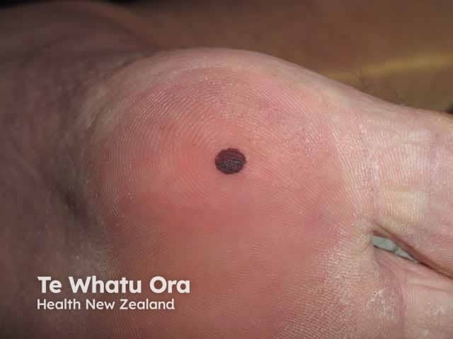 Calcaneal petechiae present as the sudden onset of lesions with intracorneal haemorrhage. These can vary in colour (red, brown, black), number, size (multiple pinpoint to large single lesions), and location (heel, sole, toe). Calcaneal petechiae are asymptomatic. Paring with a scalpel blade shows the colour is in the shavings and the colour is rapidly removed from the skin.