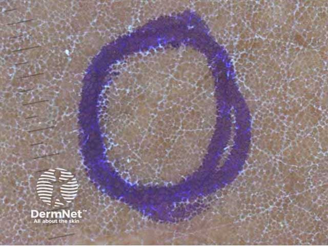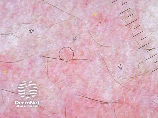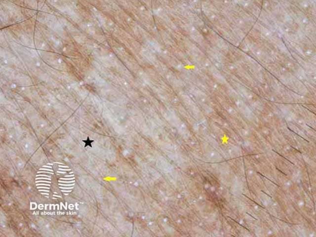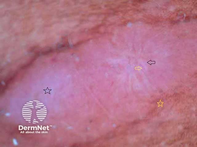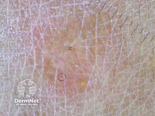 Distorted pigment network with reduction in white dots of eccrine and follicular openings. Focal white areas with white chrysalis strands are usually seen. Brown-yellow globules are not easily appreciated. White rosettes have been described in facial lesions and are non-specific, being seen in many other conditions.