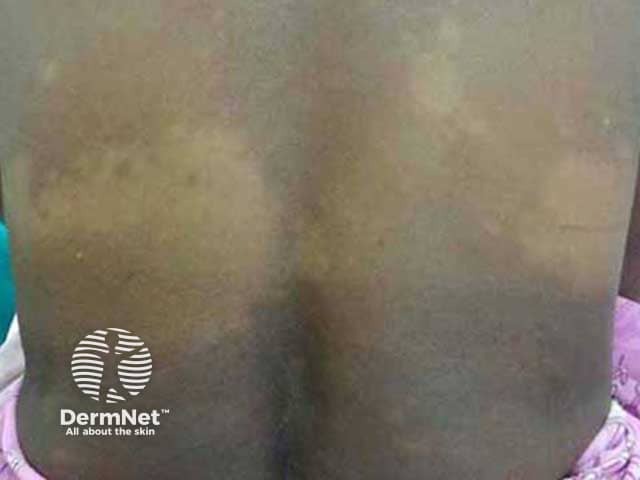 Asymmetrical distribution of erythematous infiltrated plaques in skin of colour