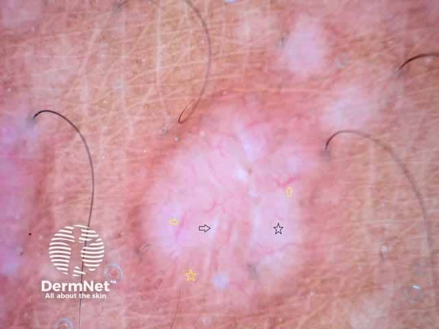Focal white areas and distorted pigment network with white structureless areas. Yellow-orange and/or brown-yellow globular structures with linear vessels are seen in facial lesions and raised extra-facial lesions.