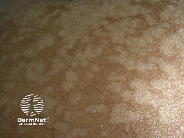 Most dermoscopy studies of pityriasis versicolor have been reported in patients with Fitzpatrick IV and V dark skin types. The patches are generally poorly defined, with non-uniform pigmentation and fine white scale. Distribution of the scale can be diffuse or focal, in skin lines, around hair follicles, or at the periphery of the lesion.