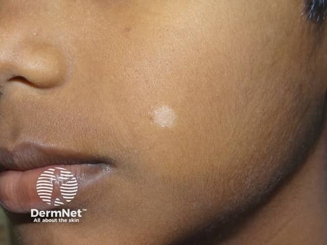 Vitiligo dermoscopy: a milky white structureless area with a diffuse ‘white glow’ due to the absence of a pigment network. Vitiligo has a well-defined border which can be hyperpigmented. The pigment network is usually absent. Hairs within the area are often white with loss of perifollicular pigmentation. [see Dermoscopy of vitiligo]