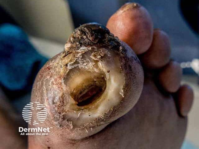 A diabetic foot ulcer is a skin sore with full thickness skin loss often preceded by a haemorrhagic subepidermal blister. The ulcer typically develops within a callosity on a pressure site, with a circular punched out appearance. It is often painless, leading to a delay in presentation to a health professional. Tissue around the ulcer may become black, and gangrene may develop. Pedal pulses may be absent and reduced sensation can be demonstrated.