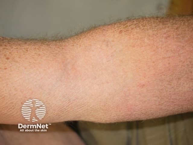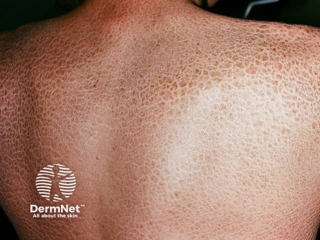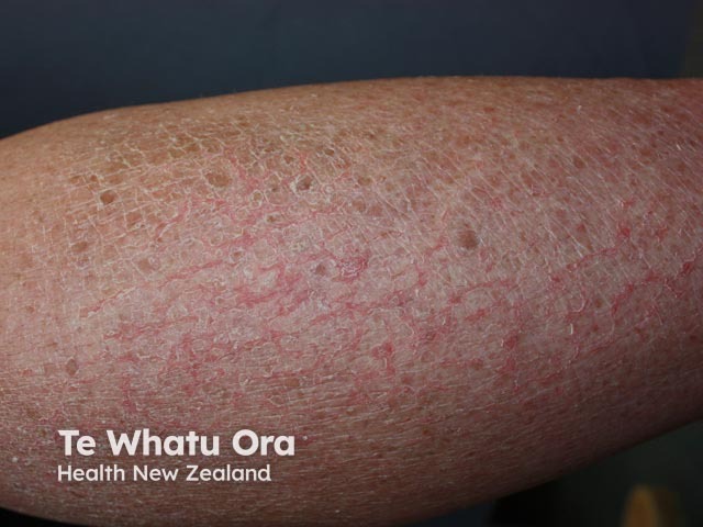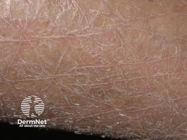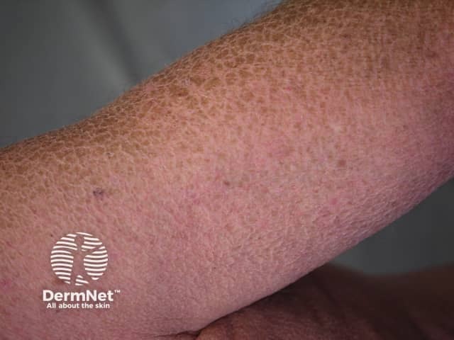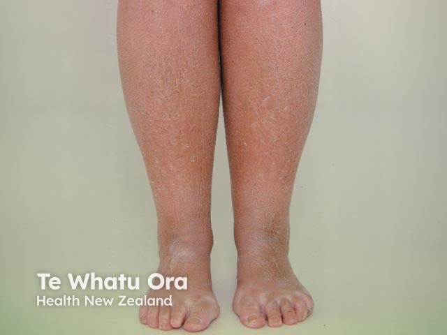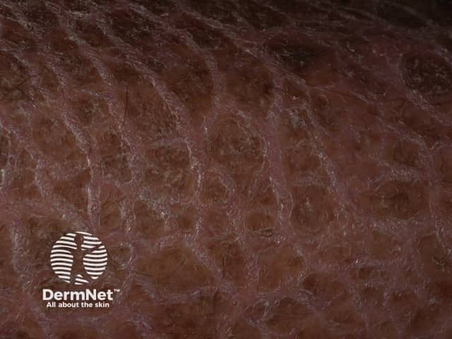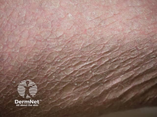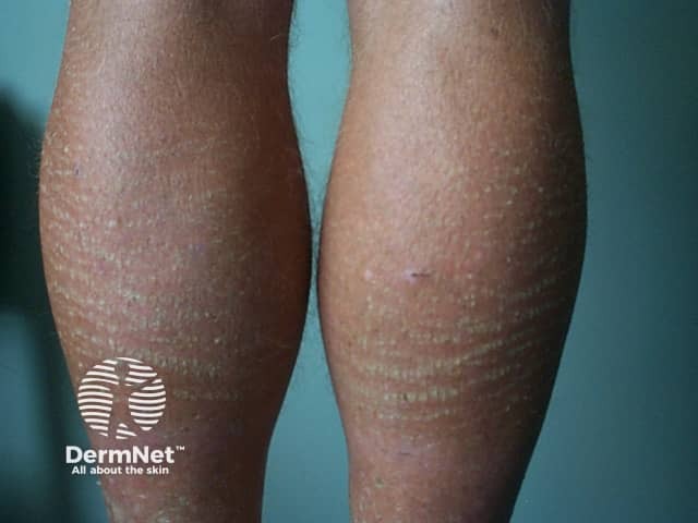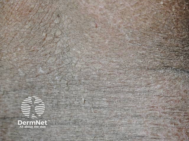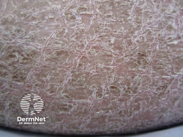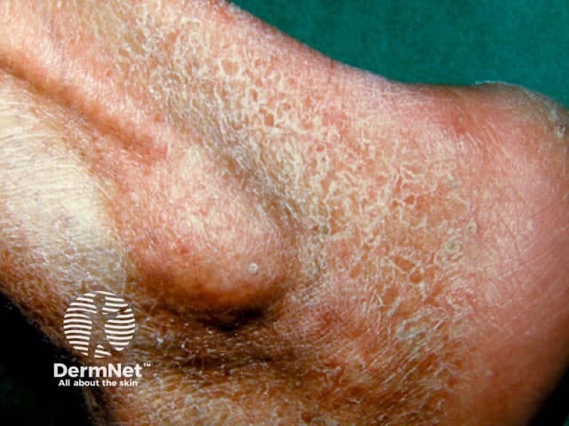 Severe plantar keratoderma and redness of the foot and ankle in bullous ichthyosiform erythroderma (KI-patient2)