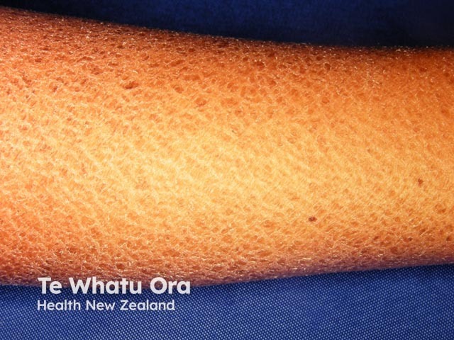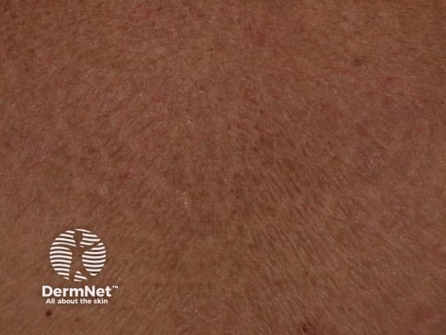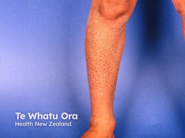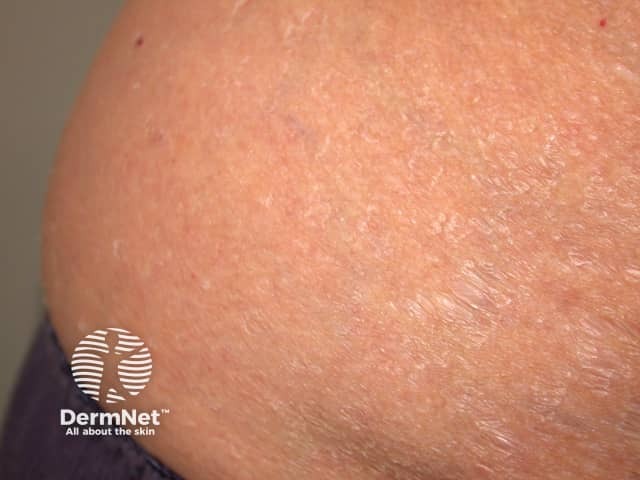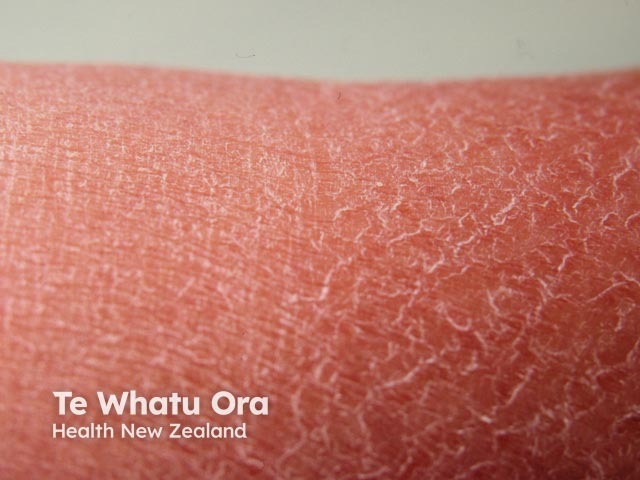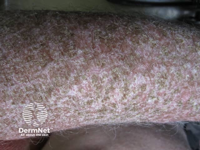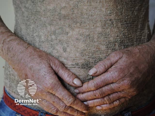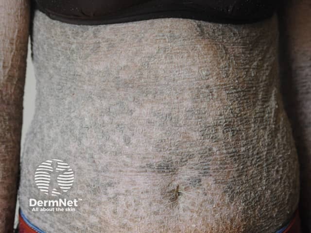 Denuded areas of skin on the abdomen and legs with erythroderma in a neonate with bullous ichthyosiform erythroderma (KI-patient1)