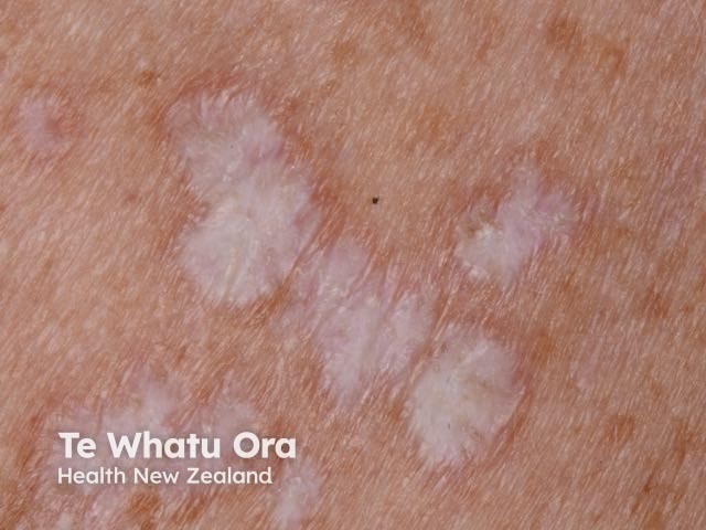 The histopathology of guttate hypomelanosis shows hyperkeratosis, flattening of rete ridges, epidermal atrophy and acanthosis. There are areas of absent and retained melanocytes; these may explain the white structureless areas and the perifollicular and perilesional pigmentation [5].