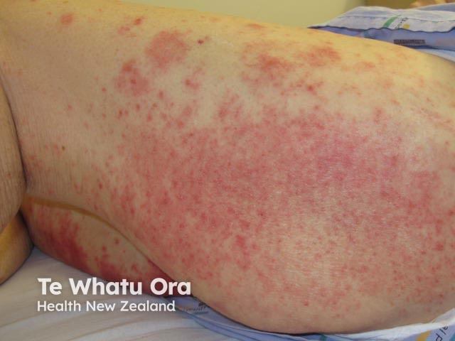 The clinical findings in incontinence-associated dermatitis are circumscribed redness and swelling of the convexities of genital and anal skin and, in some cases, erosions and blisters (bullae). Depending on position, the distribution of dermatitis can be symmetrical or asymmetrical.