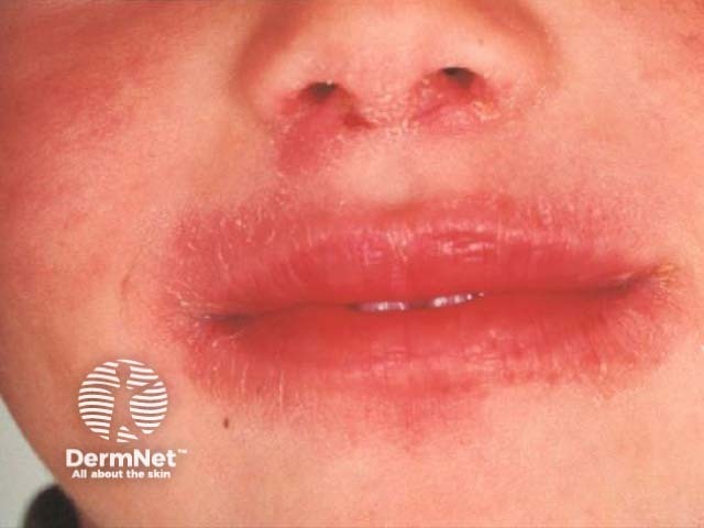 Lip licker’s dermatitis is a reaction of the lips (eczematous cheilitis) and surrounding skin (irritant contact dermatitis) due to contact with an irritating substance — in this case, saliva from the patient’s own tongue [1,2].