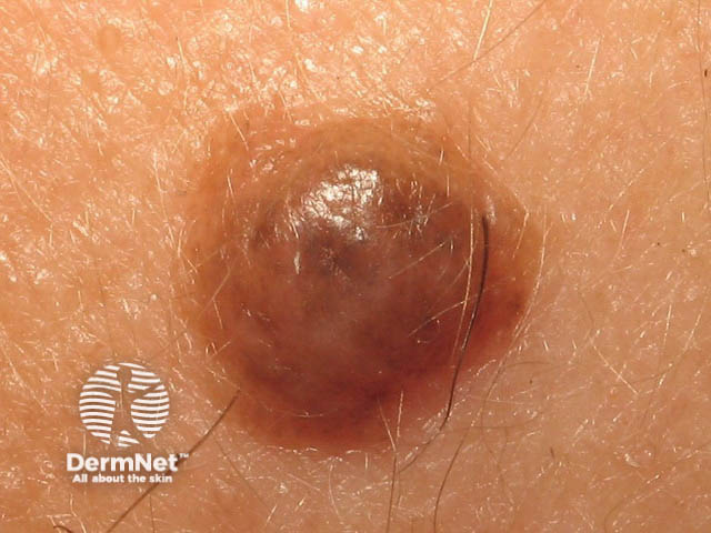 A dermal or intradermal naevus has naevus cell nests in the dermis. A papule, plaque or nodule with a pedunculated, papillomatous (Unna naevus) or smooth surface (Miescher naevus). |