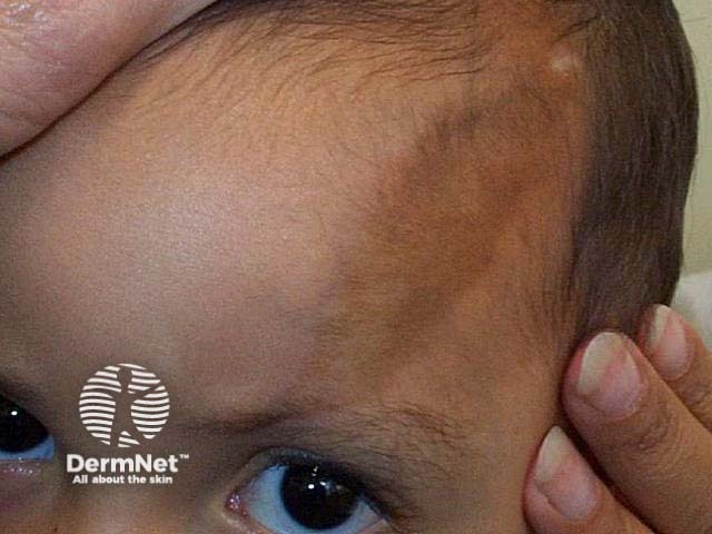 Morphoea en coup de sabre is a variant of linear morphoea (a localised form of scleroderma) restricted to the frontoparietal region (forehead). The name ‘en coup de sabre’ (the blow of a sword) derives from the characteristic scar that indents the skin of the scalp and the underlying bone. Morphoea en coup de sabre also can cut into the brain, causing neurological abnormalities and vision problems.