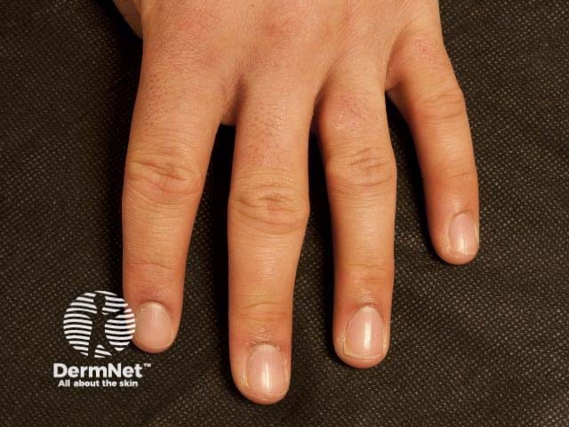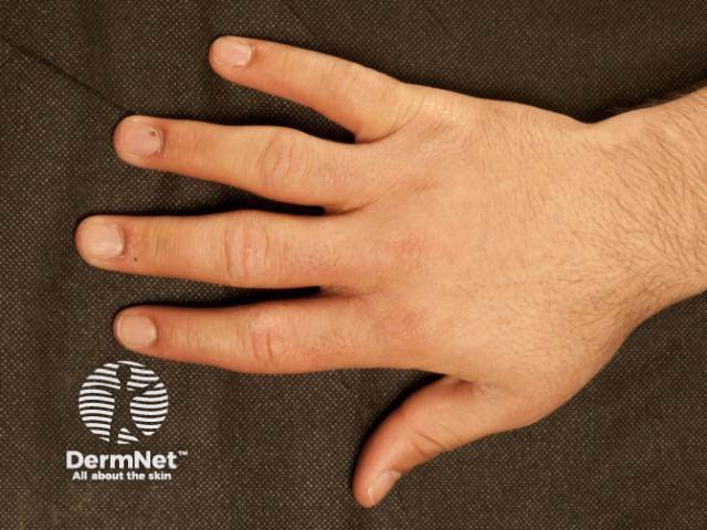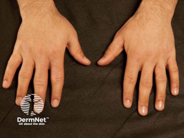 Pachydermodactyly presents as a symmetrical soft-tissue thickening of the skin on the sides of the proximal interphalangeal joints, most commonly affecting the second (index), third (middle) and fourth (ring) fingers of both hands. The thumbs and fifth fingers are rarely involved. Some patients may also have overlying hyperkeratosis, lichenification, and hyperpigmentation. Movement of the fingers is not restricted. Pachydermodactyly is not associated with symptoms such as pain or stiffness. There is no evidence of a synovitis.