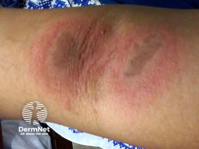 A localised streaky or linear erythema appears 24–48 hours after contact with the beetle and is typically followed by vesicles and pustules after 2–4 days [2,4,8]. Signs take a week or more to disappear [2].