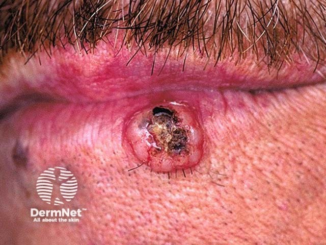A firm ulcerated squamous cell carcinoma on the lower lip