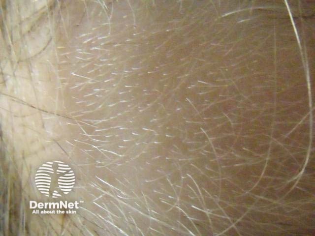 A skin biopsy is not usually required, but histology shows a normal number of hair follicles in the superficial dermis, mainly of the vellus type.